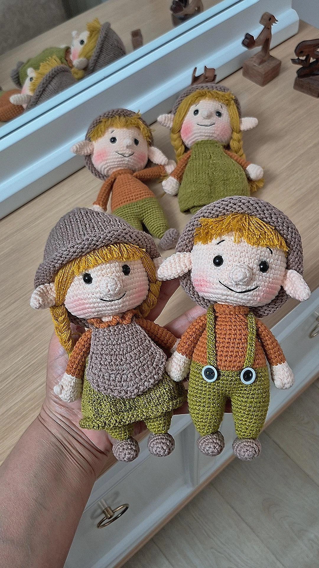 این عروسکهای دستبافت فانتزی با طراحی الهامگرفته از شخصیتهای افسانهای و گوشهای خاص الفی ساخته شدهاند. فرم کشیده و ظریف عروسک باعث میشود برای دکور اتاق کودک، هدیه خاص یا کلکسیون عروسکهای دستساز انتخابی متفاوت باشد.